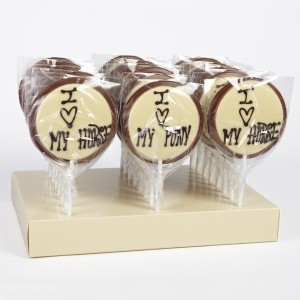 A large yummy and individually wrapped lollipop with a milk chocolate base covered on the front with white chocolate and 'hand lettered' dark chocolate with a selection of 'I (heart) my Pony' or 'I (heart) my horse slogans. A real chocolaty treat or gift for any horse enthusiast young or old.