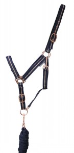 A stunning head collar perfect for any rose gold lover! Rose gold fixtures are complemented by the glamorous glitter featuring in the centre. With buckle head piece and clip throat lash for easy fastening. Comes with coordinating lead rope.